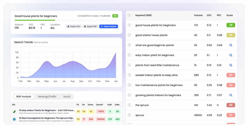 Keysearch’s main appeal is consolidation. If you’re a blogger who needs to research keywords for blog posts, YouTube, and Pinterest all in one place, it saves you from juggling multiple tools. The interface is clean and designed for people who aren’t technical.